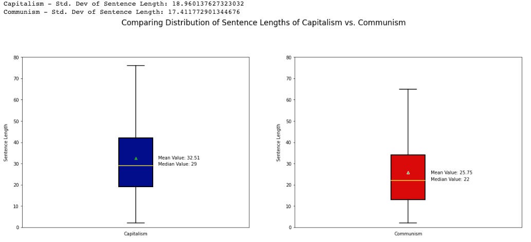 Text Characteristics - Capitalist authors were writing longer sentences than their Communist counterparts. The Communist authors’ preference for shorter sentences could be indicative of a more curt or impactful writing style.