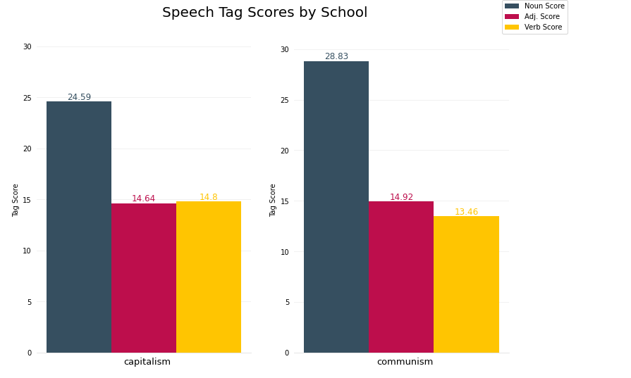 Sentence Structure - Both schools relied heavily on nouns to convey their ideals and there was little difference in their usage of adjectives. However, Capitalist authors tend to use more verbs suggesting that their writing is more action-oriented than their Communist counterparts.