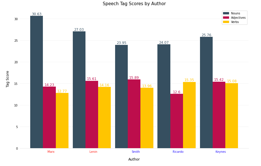 Nouns - It looks like all authors are using more nouns than either adjectives or verbs. However, both Communist writers, Marx and Lenin, have higher noun scores that their Capitalist counterparts. One could infer that these texts are more focused on people, places, and ideals.