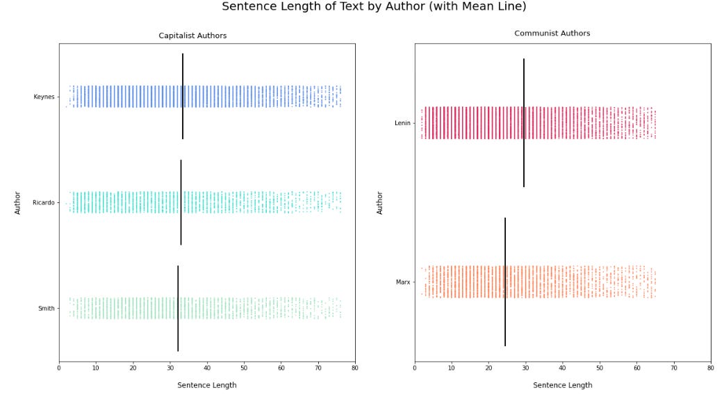 From the above, we can see that the mean sentence length of Capitalist authors, though higher as a whole, does not vary much from author to author. Conversely, there is higher difference of average sentence length between Communist authors. Marx uses the shortest sentences of all the authors in our dataset.