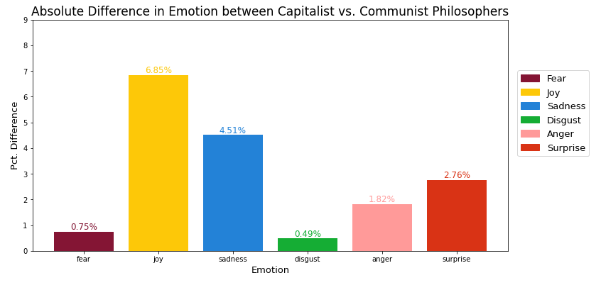 We can see that the greatest difference between the two schools lies in their usage of words that evoke Joy and Sadness. While we know that Fear was a common trait for both Communist philosophers, there isn't much difference in the usage of Fear across Capitalism and Communism, suggesting that both schools of thought utilize Fear as a driver of their messaging.