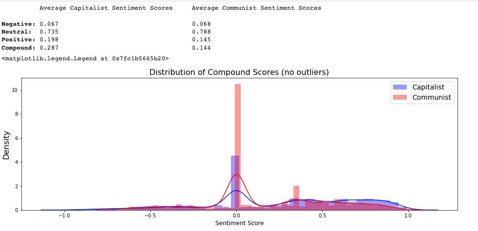 From the graph and statistics above, we can deduce that the Communist texts are comprised of sentences that are more neutral than Capitalist texts. It appears that Capitalist texts tend to convey more positive sentiments and conversely, Communist texts are slightly more negative. This aligns with my understanding of Capitalism as a quixotic ideology, where as Communism (which was born out of a critique to Capitalism) paints a more pessimistic future. That being said, the compound scores of both schools are in the 'positive' range. Perhaps this is because our authors are writing with the intent of convincing? You can’t make someone believe your view is the best without conveying a largely positive message.