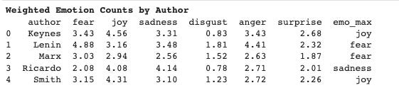 From the above, we can see that Keynes and Smith, both Capitalists, seem to evoke 'Joy' as their primary emotion. This aligns with the findings from our previous section, where we saw that Capitalist writers' sentences received higher positive sentiment scores on average. Conversely, both of our Communist philosophers, Lenin and Marx seem to primarily evoke 'Fear'. Ricardo seems to rely most on 'Sadness' to communicate his message, though the numbers show that his secondary emotion is indeed 'Joy'.